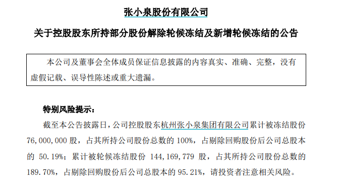 《财中社》注意到,张小泉已经发布了多条大股东张小泉集团股权遭冻结的公告。截至3月19日,张小泉集团累计被冻结股份7600万股,占持有张小泉股份的100%;累计被轮候冻结股份1.4亿股,占其所持公司股份总数的189.7%。