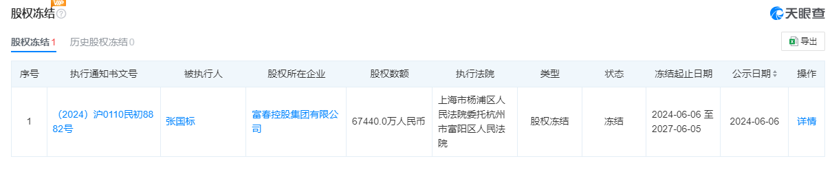 天眼查显示,4月1日,富春控股集团新增两条被执行人信息,执行标的金额分别为4068万元和656万元。此前的3月28日,公司新增执行标的金额达到31.3亿元。