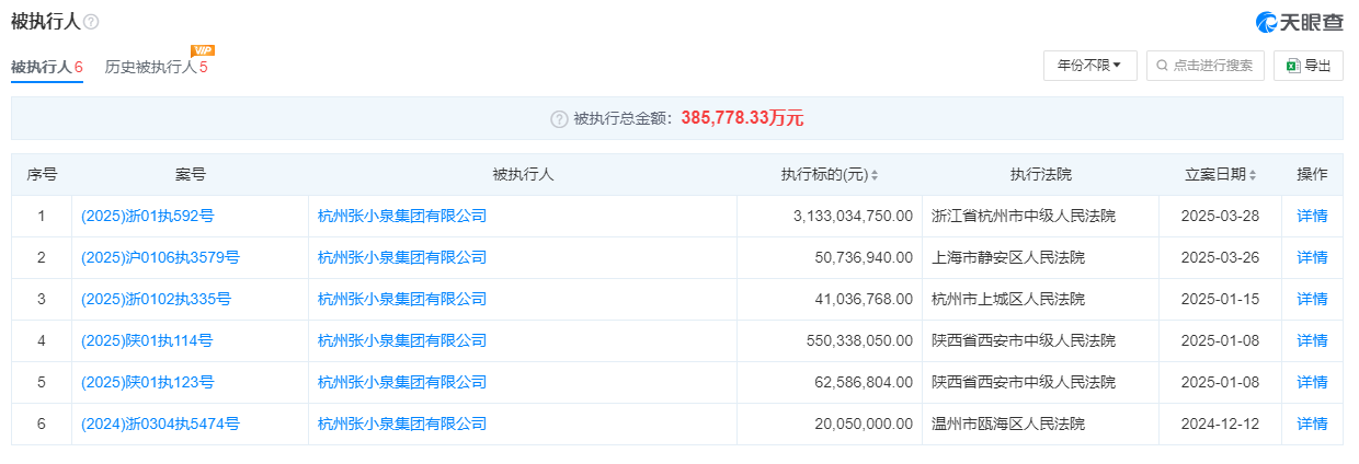 张小泉的直接大股东杭州张小泉集团有限公司(下称“张小泉集团”)同样官司缠身。截至4月1日,公司累计被执行总金额为38.6亿元。最近的一笔是3月28日的31.3亿元。